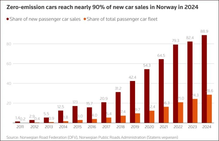 挪威是石油出产国,但近年来出台了针对电动汽车的优惠政策,电动汽车的市场占比逐年上升。本地时间1月2日,挪威道结合会(OFV)暗示,2024年,挪威发卖的新车中有九成是电动汽车,距离实现2025年只发卖电动汽车的方针仅剩10%。